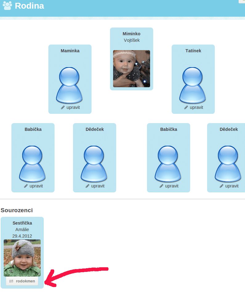 V rodině nového dítěte je dole vidět také jeho sourozenec. Pod svým obrázkem má tlačítko pro zkopírování rodokmenu. Stačí kliknout a všichni rodinní příslušníci prvního dítěte se objeví i u nového!