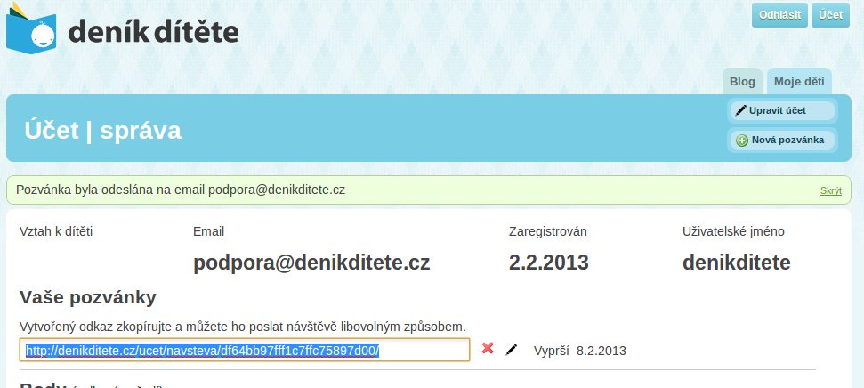Po vytvoření pozvánky jsme zpět na stránce účtu a všechny pozvánky zde jsou vidět. Pokud chcete pozvánku poslat sami, tak stačí zobrazený odkaz (což je ona pozvánka) zkopírovat a libovolným způsobem poslat návštěvníkovi. Pokud nezvolíte nějaké omezení platnosti pozvánky, tak je nutné udržet ji v tajnosti, jinak přes ni může kdokoliv, kdo ji získá prohlížet vaše deníčky. Pozvánky je zde možné také upravovat, případně smazat.