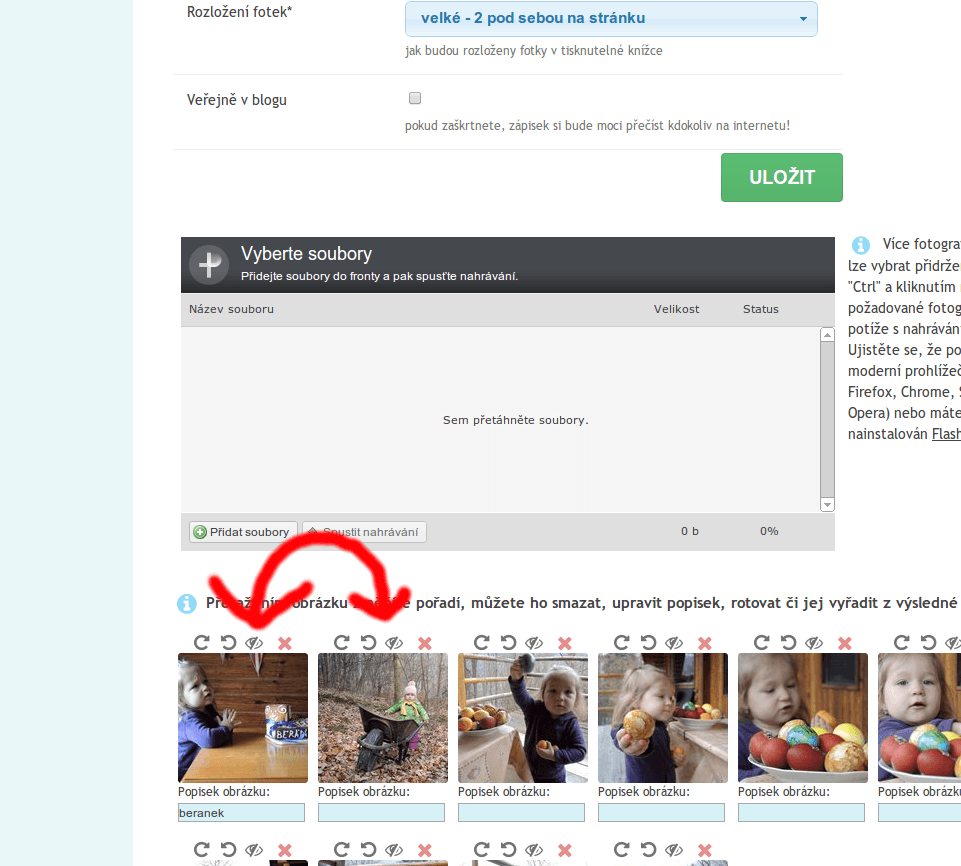 Podobně se vybírají fotografie. Při úpravě zápisků je u každé fotografie tlačítko, kterým ji lze z knížky vyřadit (nebo znovu přidat).